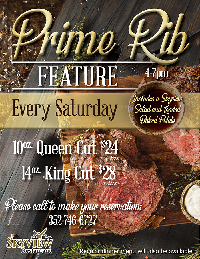 Home Events - Citrus Hills Skyview Prime Rib Feature Skyview Prime Rib Feature + Add to Google Calendar + iCal / Outlook export Date April 11 Time 4:00 pm - 7:00 pm Location Skyview Restaurant 2100 N Terra Vista Blvd, Hernando, FL 34442 Category RestaurantsSkyview Share this event