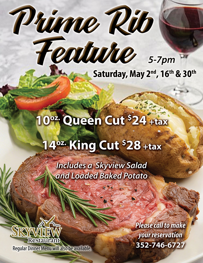 Home Events - Citrus Hills Skyview Prime Rib Feature Skyview Prime Rib Feature + Add to Google Calendar + iCal / Outlook export Date May 2 Time 5:00 pm - 7:00 pm Location Skyview Restaurant 2100 N Terra Vista Blvd, Hernando, FL 34442 Category RestaurantsSkyview Share this event