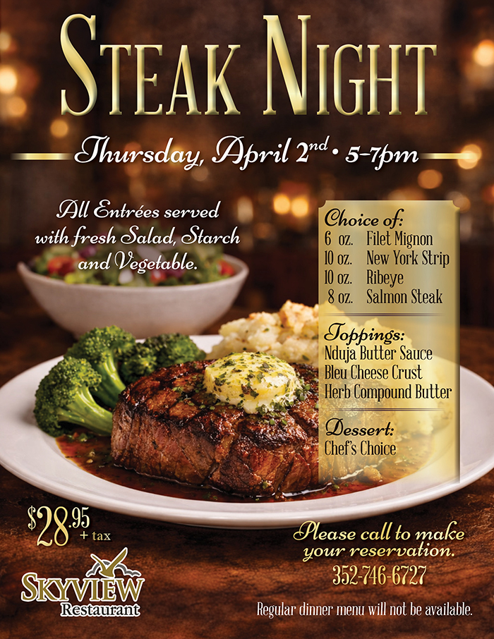 Home Events - Citrus Hills Skyview Steak Night Skyview Steak Night + Add to Google Calendar + iCal / Outlook export Date April 2 Time 5:00 pm - 7:00 pm Location Skyview Restaurant 2100 N Terra Vista Blvd, Hernando, FL 34442 Category RestaurantsSkyview Share this event