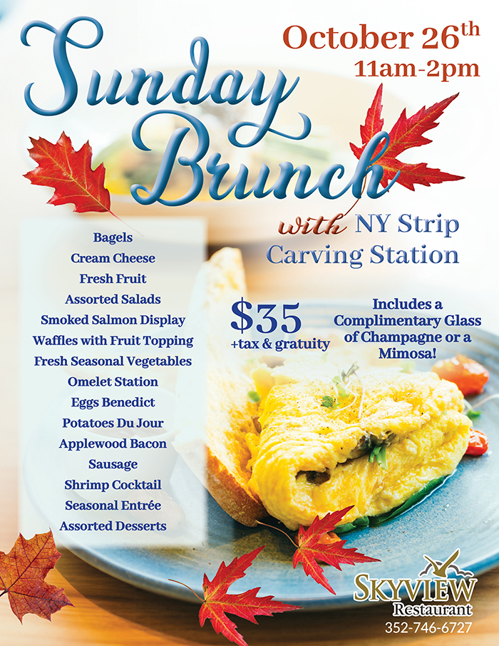 Home Events - Citrus Hills Skyview Sunday Brunch Skyview Sunday Brunch + Add to Google Calendar + iCal / Outlook export Date October 26 Time 11:00 am - 2:00 pm Category Skyview Share this event