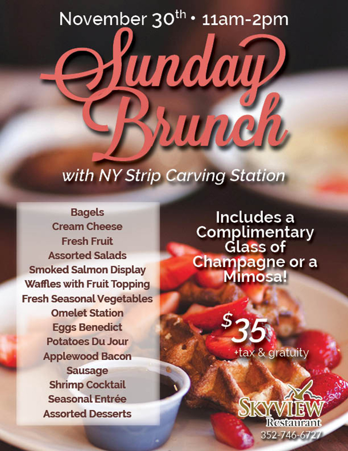 Home Events - Citrus Hills Skyview Sunday Brunch Skyview Sunday Brunch + Add to Google Calendar + iCal / Outlook export Date November 30 Time 11:00 am - 2:00 pm Category Skyview Share this event