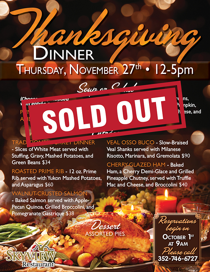 Home Events - Citrus Hills SOLD OUT: Skyview Thanksgiving Dinner SOLD OUT: Skyview Thanksgiving Dinner + Add to Google Calendar + iCal / Outlook export Date November 27 Time 12:00 pm - 5:00 pm Location Skyview Restaurant 2100 N Terra Vista Blvd, Hernando, FL 34442 Category RestaurantsSkyview Share this event
