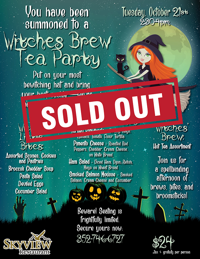 Home Events - Citrus Hills SOLD OUT: Skyview Witches Brew Tea Party SOLD OUT: Skyview Witches Brew Tea Party + Add to Google Calendar + iCal / Outlook export Date October 21 Expired! Time 2:30 pm - 4:00 pm Location Skyview Restaurant 2100 N Terra Vista Blvd, Hernando, FL 34442 Category RestaurantsSkyview Share this event