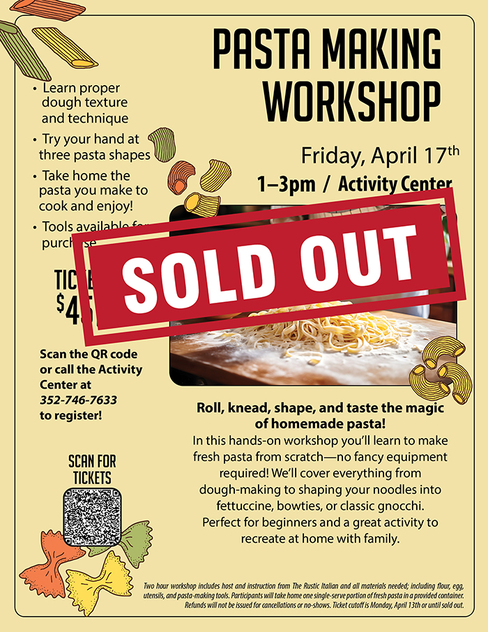 Home Citrus Hills Golf & Country Club SOLD OUT: Pasta Making Workshop SOLD OUT: Pasta Making Workshop + Add to Google Calendar + iCal / Outlook export Date April 17 Time 1:00 pm - 3:00 pm Location Activity Center Activity Center Category Club EventsSocial Events Share this event