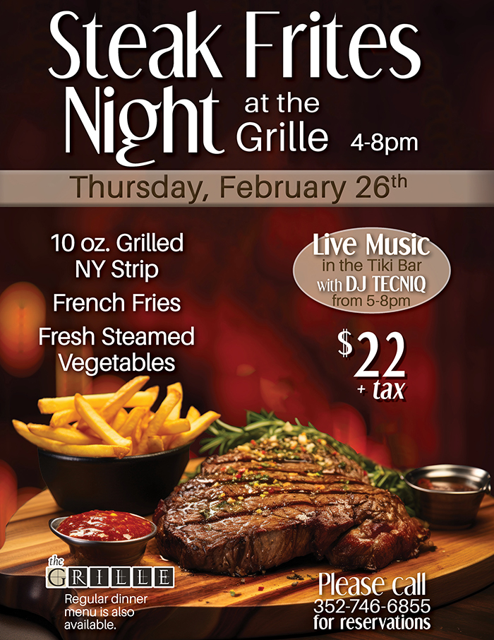 Home Events - Citrus Hills Steak Frites Night at the Grille Steak Frites Night at the Grille + Add to Google Calendar + iCal / Outlook export Date February 26 Time 4:00 pm - 8:00 pm Location The Grille 505 E Hartford St, Hernando, FL 34442 Category RestaurantsThe Grille Share this event