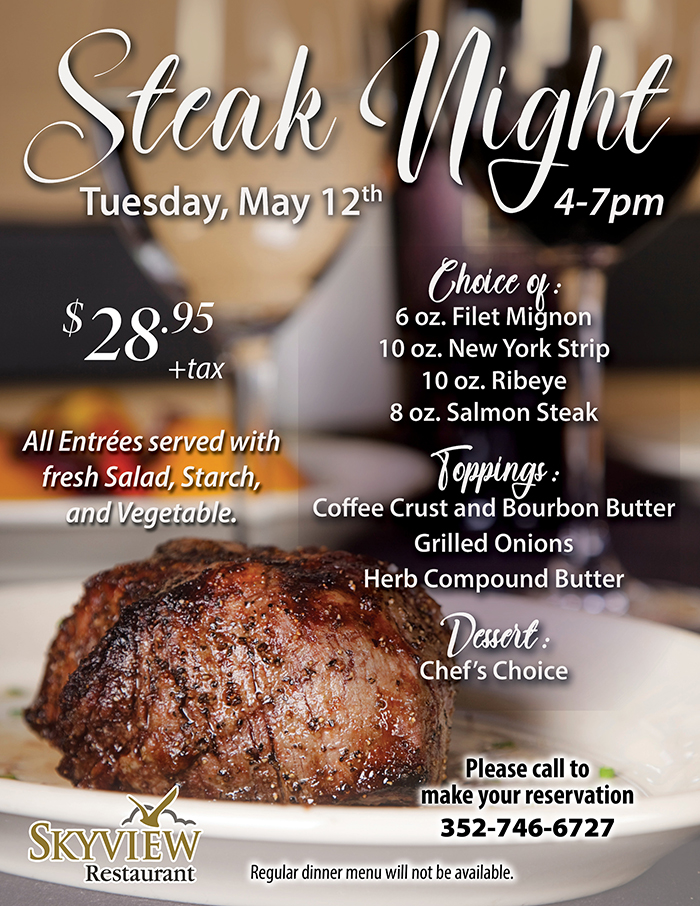 Home Events - Citrus Hills Steak Night at Skyview Restaurant Steak Night at Skyview Restaurant + Add to Google Calendar + iCal / Outlook export Date May 12 Time 4:00 pm - 7:00 pm Location Skyview Restaurant 2100 N Terra Vista Blvd, Hernando, FL 34442 Category RestaurantsSkyview Share this event