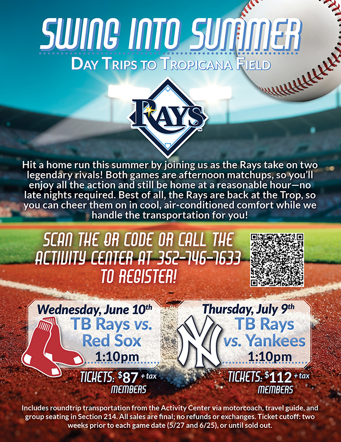 Home Events - Citrus Hills Swing into Summer: Day Trip to Tropicana Field, Tampa Bay Rays vs. Boston Red Sox Swing into Summer: Day Trip to Tropicana Field, Tampa Bay Rays vs. Boston Red Sox + Add to Google Calendar + iCal / Outlook export Date June 10 Time 1:00 pm - 4:00 pm More Info Purchase Tickets Location Activity Center Activity Center Category Social EventsTravel Events Purchase Tickets Share this event