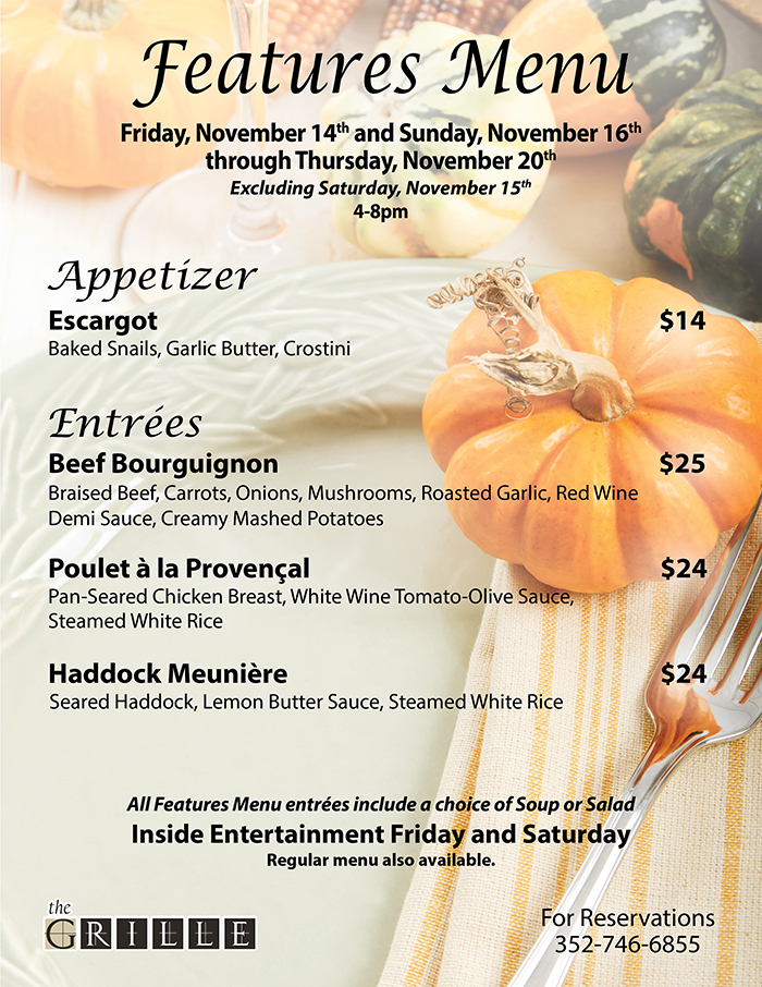Home Events - Citrus Hills the Grille Features Menu the Grille Features Menu + Add to Google Calendar + iCal / Outlook export Date November 14 Expired! Time 4:00 pm - 8:00 pm Location The Grille 505 E Hartford St, Hernando, FL 34442 Category The Grille Share this event