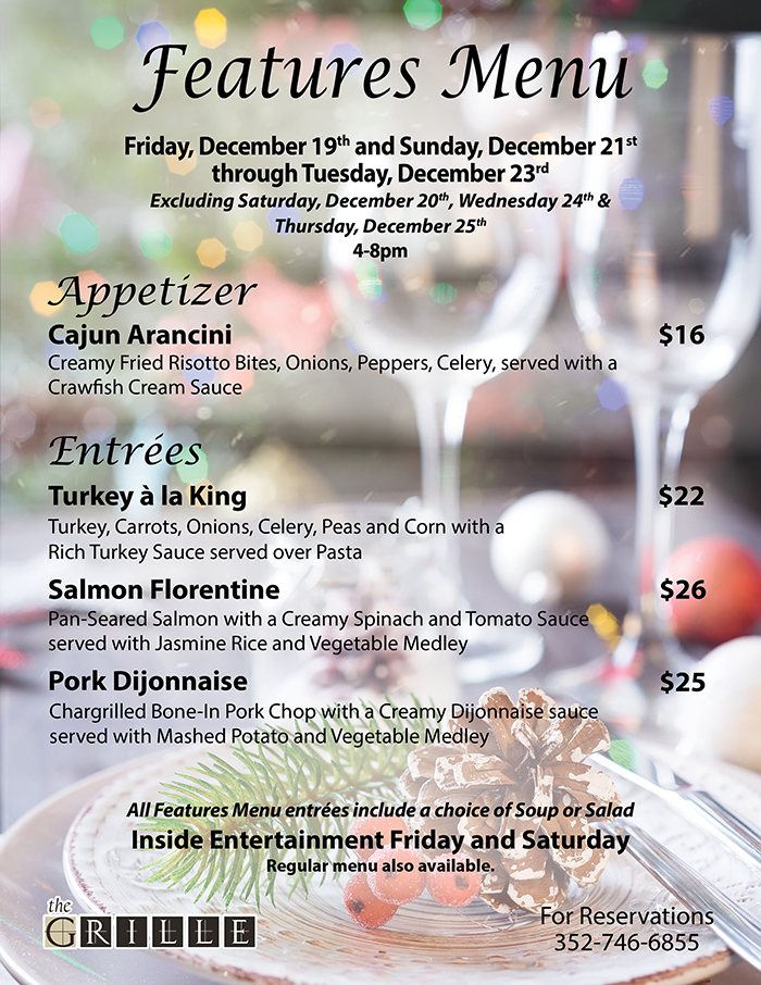 Home Events - Citrus Hills the Grille Features Menu the Grille Features Menu + Add to Google Calendar + iCal / Outlook export Date December 22 Time 4:00 pm - 8:00 pm Location The Grille 505 E Hartford St, Hernando, FL 34442 Category The Grille Share this event