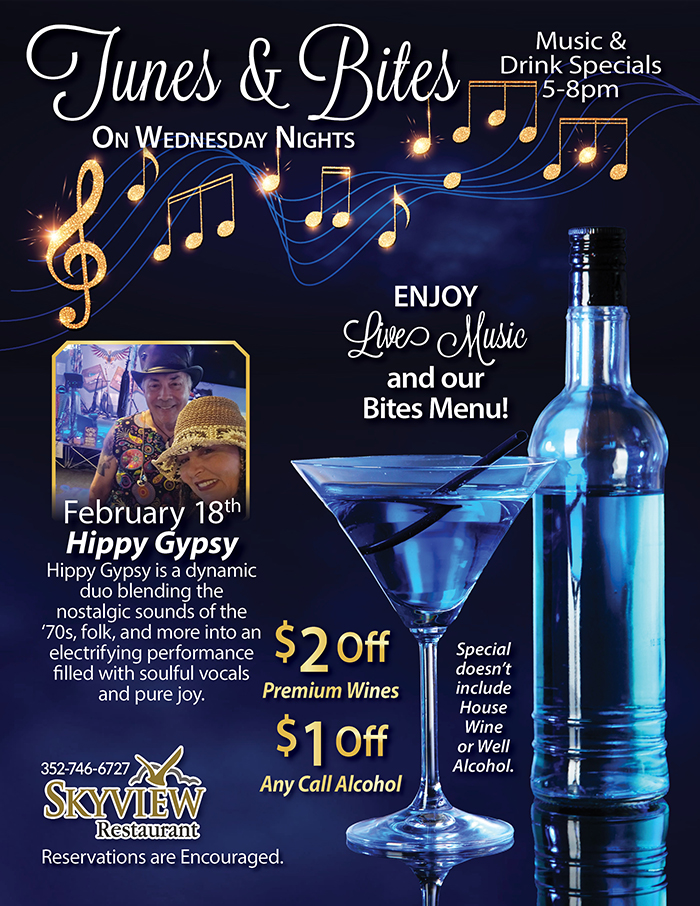 Home Events - Citrus Hills Tunes & Bites on Wednesday Nights with Hippy Gypsy Tunes & Bites on Wednesday Nights with Hippy Gypsy + Add to Google Calendar + iCal / Outlook export Date February 18 Time 5:00 pm - 8:00 pm Location Skyview Restaurant 2100 N Terra Vista Blvd, Hernando, FL 34442 Category Live EntertainmentSkyview Share this event