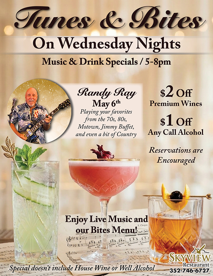 Home Events - Citrus Hills Tunes & Bites on Wednesday Nights with Randy Ray Tunes & Bites on Wednesday Nights with Randy Ray + Add to Google Calendar + iCal / Outlook export Date May 6 Time 5:00 pm - 8:00 pm Location Skyview Restaurant 2100 N Terra Vista Blvd, Hernando, FL 34442 Category RestaurantsSkyview Share this event