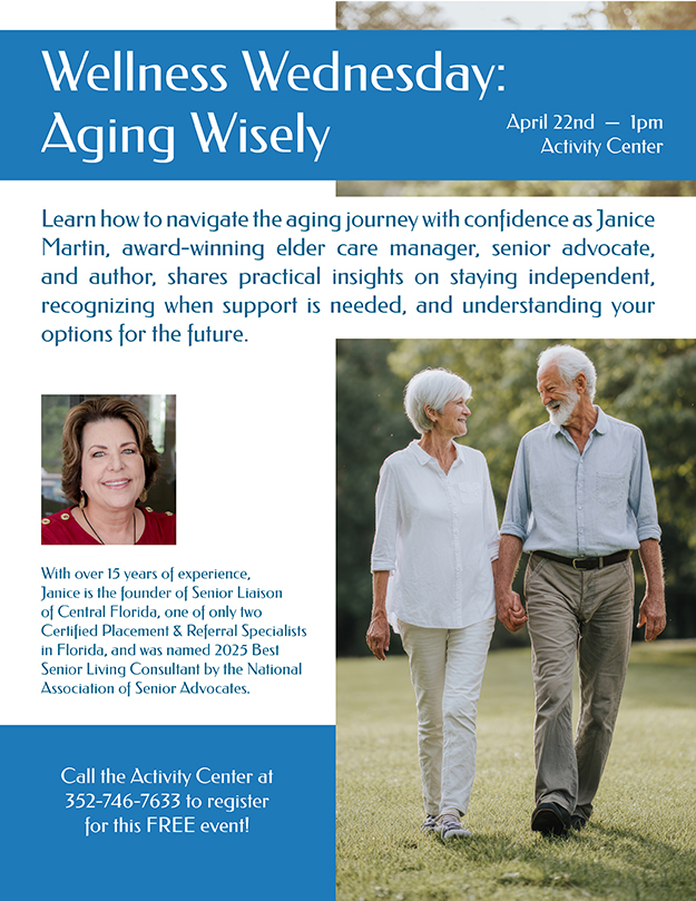Home Events - Citrus Hills Wellness Wednesday: Aging Wisely Wellness Wednesday: Aging Wisely + Add to Google Calendar + iCal / Outlook export Date April 22 Time 1:00 pm - 3:00 pm Location Activity Center Activity Center Category Social Events Share this event