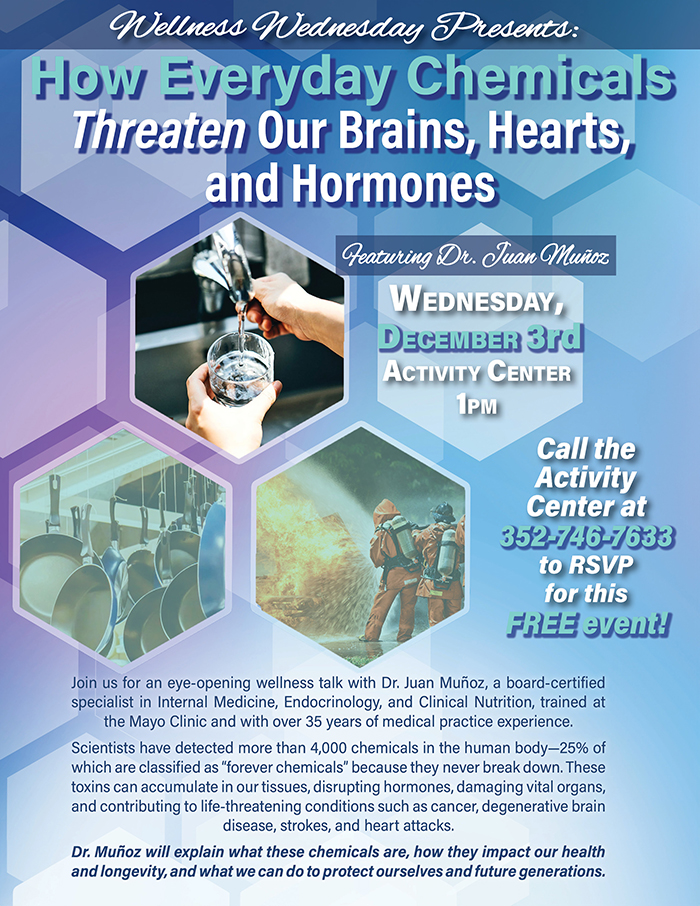 Home Events - Citrus Hills Wellness Wednesday: How Everyday Chemicals Threaten Our Brains, Hearts, & Hormones Wellness Wednesday: How Everyday Chemicals Threaten Our Brains, Hearts, & Hormones + Add to Google Calendar + iCal / Outlook export Date December 3 Time 1:00 pm - 2:00 pm Location Activity Center Activity Center Category Club EventsSocial Events Share this event