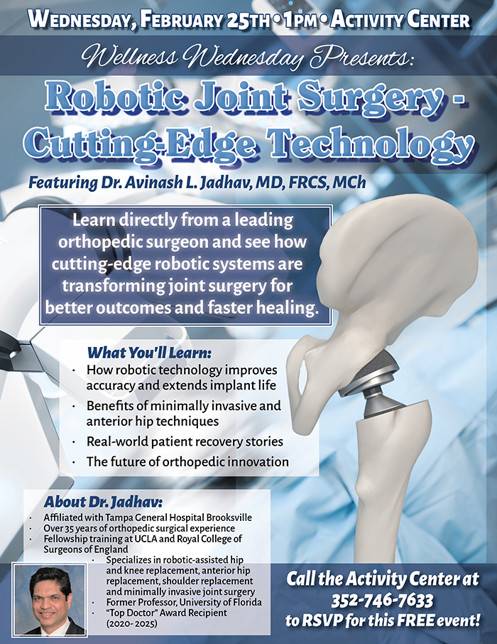 Home Events - Citrus Hills Wellness Wednesday: Robotic Joint Surgery Wellness Wednesday: Robotic Joint Surgery + Add to Google Calendar + iCal / Outlook export Date February 25 Time 1:00 pm - 3:00 pm Location Activity Center Activity Center Category Club EventsSocial Events Share this event